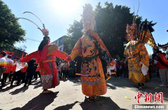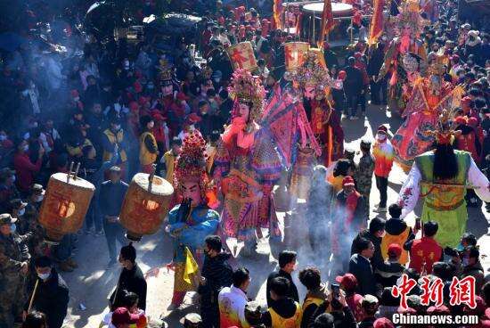 1月31日,福建省福州市长乐区潭头镇厚福村举行传统民俗文化活动。厚福村是福建著名侨乡,该村民俗文化活动于每年正月初十及正月二十六举行,至今已有400多年的历史。活动举行期间,全体村民踊跃参与,祈福国泰民安、风调雨顺。图为民俗文化活动中的巡游队伍。