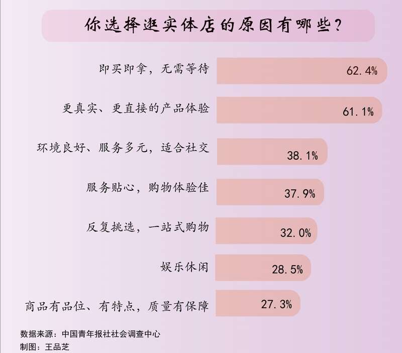 当下网购迅速发展,但不少人依然热衷于逛实体店。近日,中国青年报社社会调查中心联合问卷网(wenjuan.com),对1615名受访者进行的一项调查显示,大家逛实体店的原因主要有即买即拿,无需等待(62.4%)和更真实、更直接的产品体验(61.1%)。
