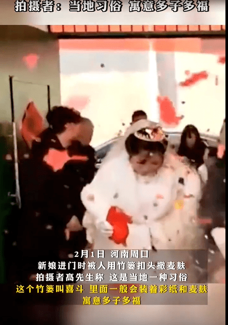 新娘进门时,忽然被人用竹篓扣头、撒麦麸。近日,河南周口一段婚礼视频引发热议。拍摄者称,这是当地的一种习俗,这个竹篓叫喜斗,里面一般会装着彩纸和麦麸,寓意多子多福。上前扣喜斗的都是和新郎新娘关系很好的亲友,并没有恶意。