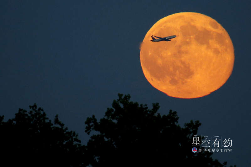 这是2015年7月31日在美国泽西城拍摄的一架飞机从“蓝月亮”前飞过。新华社/美联
