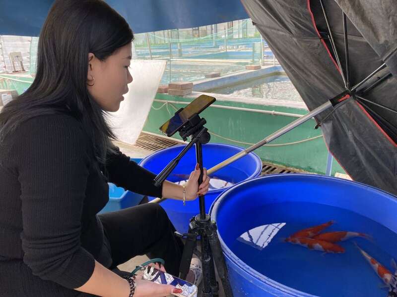 光顺锦鲤养殖合作社社员冯月童正在通过电商直播销售锦鲤。(受访者供图)