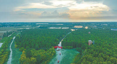 江苏省高邮市清水潭湿地公园,游船穿行其中,一路景色美不胜收。