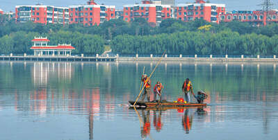 辽宁省锦州市小凌河,工作人员在清理河道。