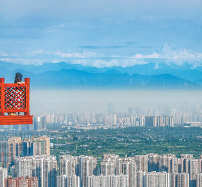 四川省成都市天府新区,市民登上观景平台,远眺城市与雪山。