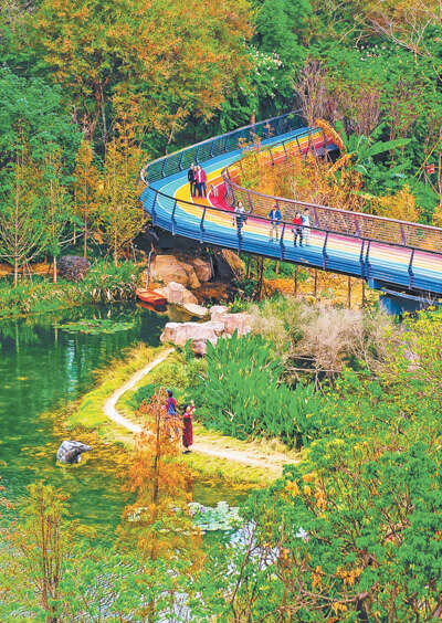游人在福建省福州市福山郊野公园彩虹步道上游玩。
