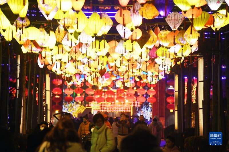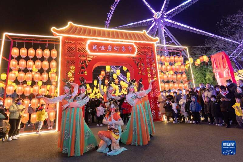 在上海锦江乐园举办的“盛世唐灯市集”主题活动上,游客逛集市、赏花灯、品美食,观看霓裳飞天舞、舞狮等民俗表演,体验丰富多彩的元宵活动。