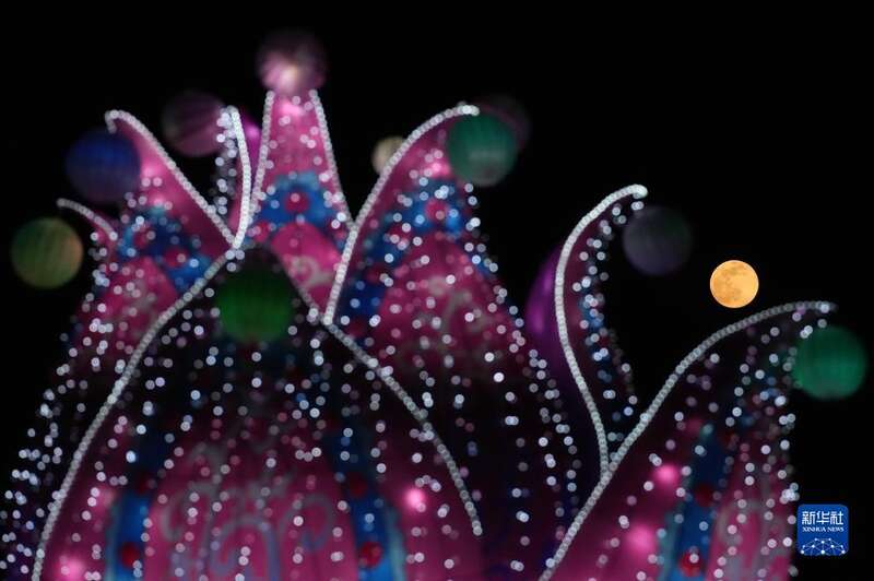 2月5日在北京世园公园拍摄的月亮和花灯。