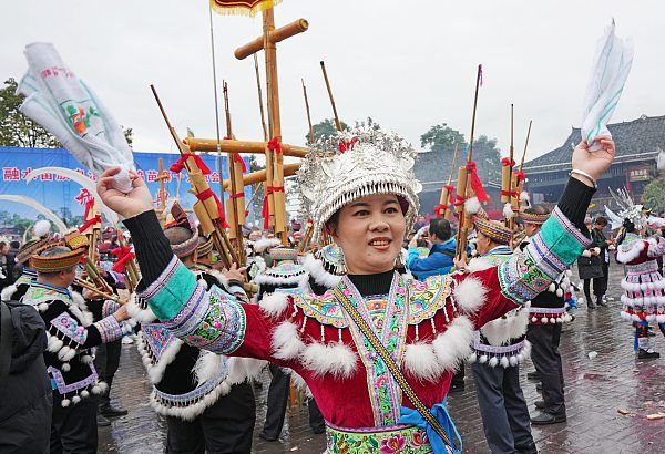 2023年2月9日,广西柳州,在融水苗族自治县梦呜苗寨举行的正月十九坡会上,苗家女表演芦笙舞。