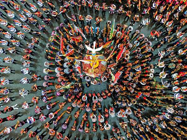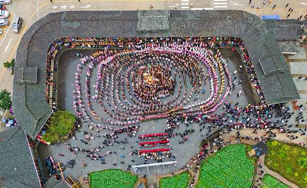 2023年2月9日,广西柳州,在融水苗族自治县梦呜苗寨举行的正月十九坡会上,游人观看大型芦笙踩堂。(无人机照片)