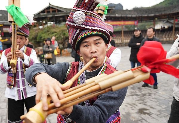 2023年2月9日,广西柳州,在融水苗族自治县梦呜苗寨举行的正月十九坡会上,芦笙手吹奏芦笙。