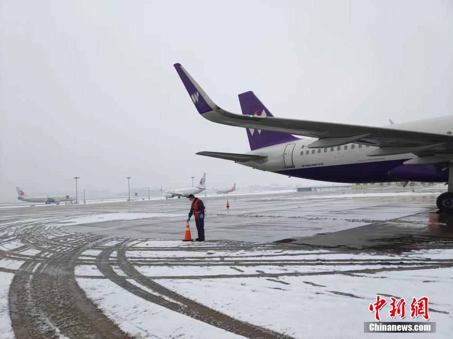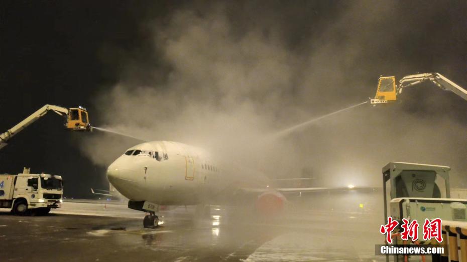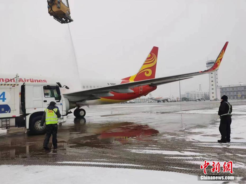 海航航空旗下海航技术飞机维修人员正在对即将出港的飞机进行除防冰工作。赵海 摄