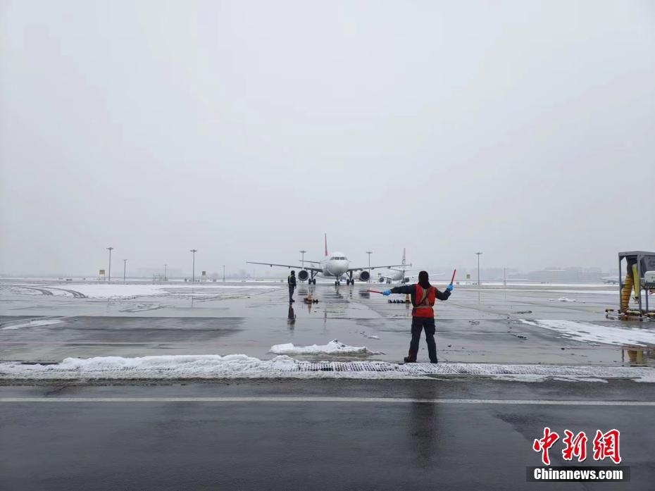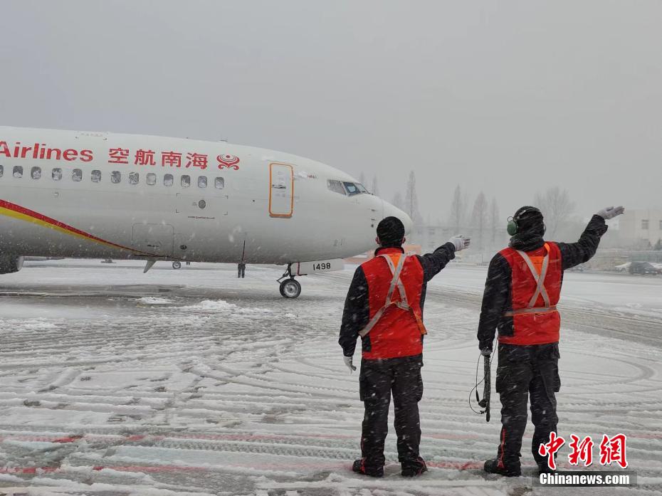 2023年2月8日至9日,山西省迎来大范围雨雪天气过程。山西省气象台接连发布暴雪蓝色预警和道路结冰黄色预警。目前正值春运返程高峰,雨雪天气对交通运输行业影响较大。图为海航航空旗下海航技术飞机维修人员正在对飞机进行除防冰工作。赵海 摄