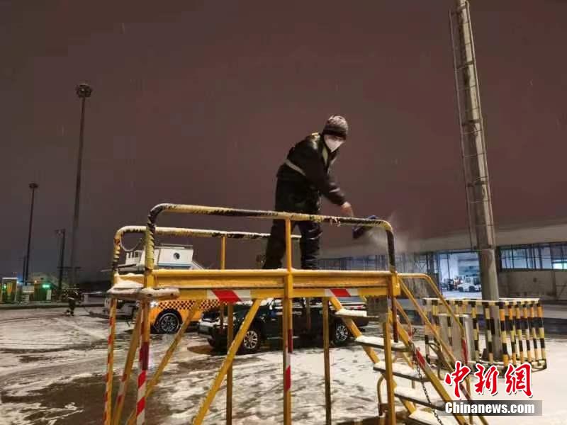 为了给旅客提供安全、舒适的出行环境,自春运开始以来,民航人始终坚守在自己的岗位上,用严谨的态度、真情的服务,确保每一架飞机安全可靠,确保每一位旅客平安而归。图为海航航空旗下海航技术飞机维修人员正在对使用的梯架除雪。赵海 摄