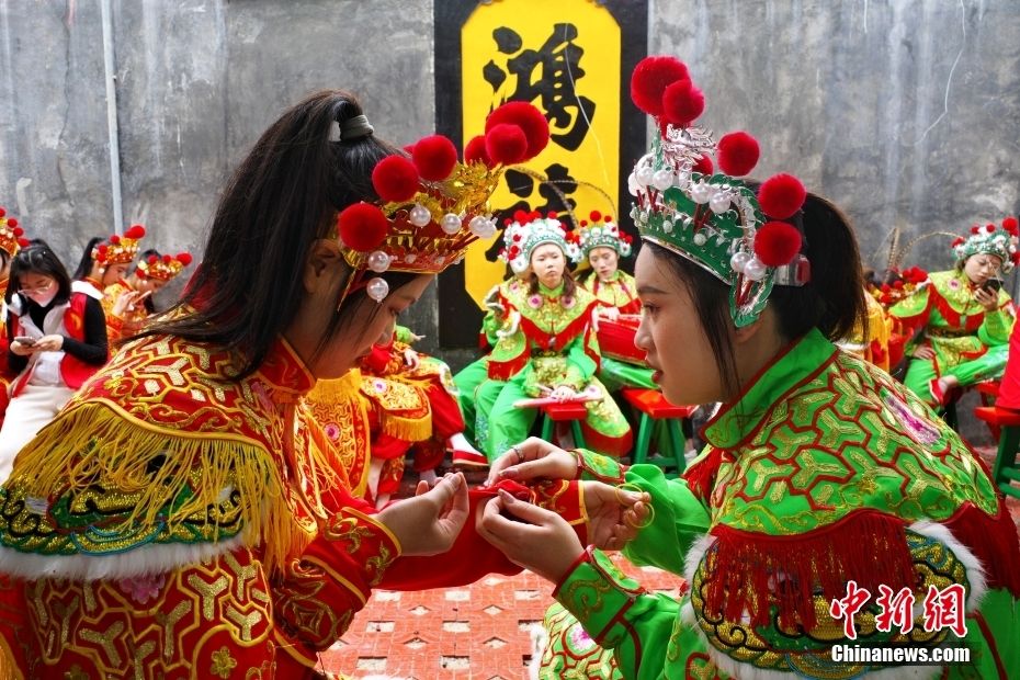 2月9日,广东省潮州市潮安区,潮阳西门女子英歌队亮相仙都乡妈祖文化巡游活动。妆扮为穆桂英、花木兰等巾帼人物的女子英歌队队员们,英姿飒爽、步伐轻盈,在阵阵击鼓声和口哨声中不断变化阵型,表演柔中带刚,“圈粉”无数。图为潮阳西门女子英歌队队员在休息间隙,整理仪容仪表。中新社记者 陈楚红 摄