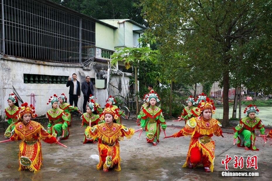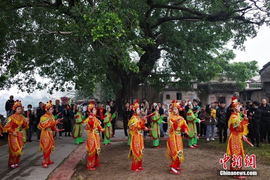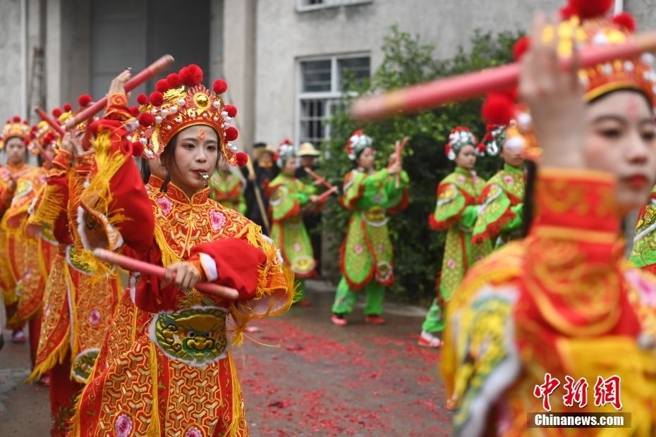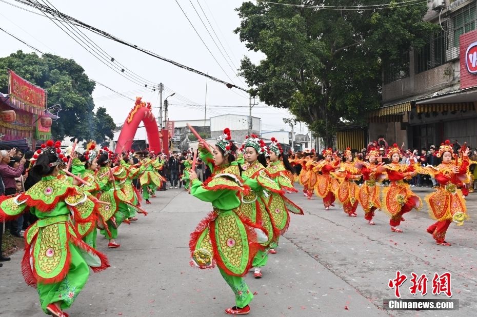 2月9日,广东省潮州市潮安区,潮阳西门女子英歌队亮相仙都乡妈祖文化巡游活动。妆扮为穆桂英、花木兰等巾帼人物的女子英歌队队员们,英姿飒爽、步伐轻盈,在阵阵击鼓声和口哨声中不断变化阵型,表演柔中带刚,“圈粉”无数。图为潮阳西门女子英歌队在表演中。中新社记者 陈楚红 摄