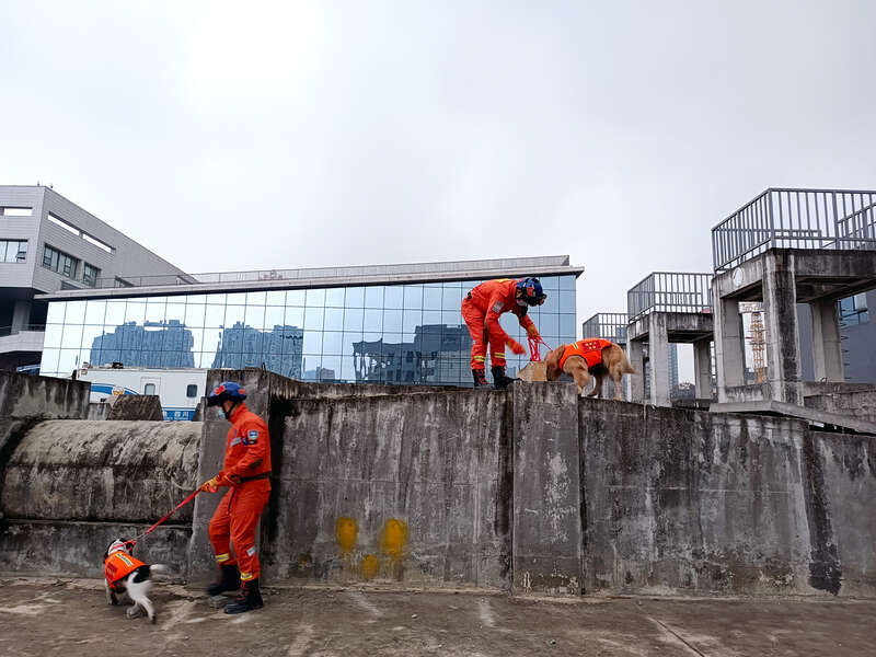 2月8日,四川成都,搜救犬闪电和麒麟正在搜索受困者。据了解,此次演练投入包括模块化地震救援车、班组突击车、无人机、液压顶撑气垫、雷达生命探测仪等100余件套以及4只搜救犬。程雪力/摄