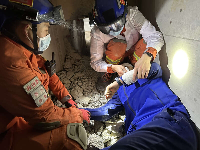 2月8日,四川成都,四川省森林消防总队特勤大队进行地震救援演练,消防员正在对受困者进行医疗救护。近日,土耳其发生7.8级震群型地震,伴随极端天气进一步加大生命财产损失,为我们带来警示。这次演练模拟某地发生7.0级地震,现场大量房屋倒塌,人员被困,部分道路塌陷,交通不畅,通信、供电、供水中断,同时伴有大风、大雪、低温等极端恶劣天气的情况。程雪力/摄