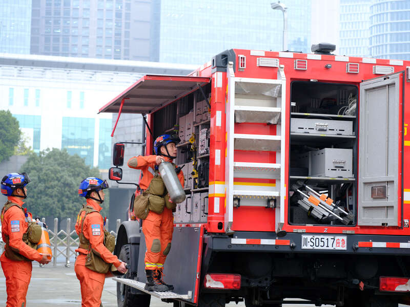 2月8日,四川成都,消防员正在检查乌尼莫克模块化地震救援车上的装备。 程雪力/摄