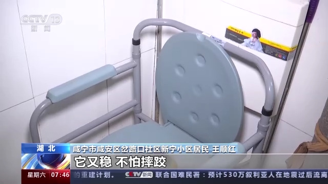 湖北省咸宁市咸安区岔路口社区新宁小区居民 王顺红:原来就用脚盆,给他擦洗。现在配了洗浴凳方便多了,它又稳,不怕摔跤,这个带来很大方便。