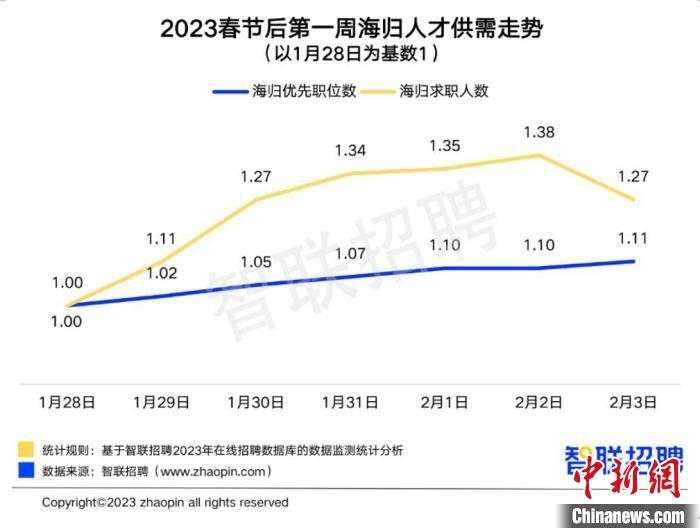 数据显示,当前国内企业对海外人才的需求快速释放,对海归人才的需求呈上升趋势。2023年春节后首周,海归优先的职位数和在国内求职的海归人数均呈上扬态势,2月3日的海归优先职位数比1月28日增长11%,海归求职人数增长27%。