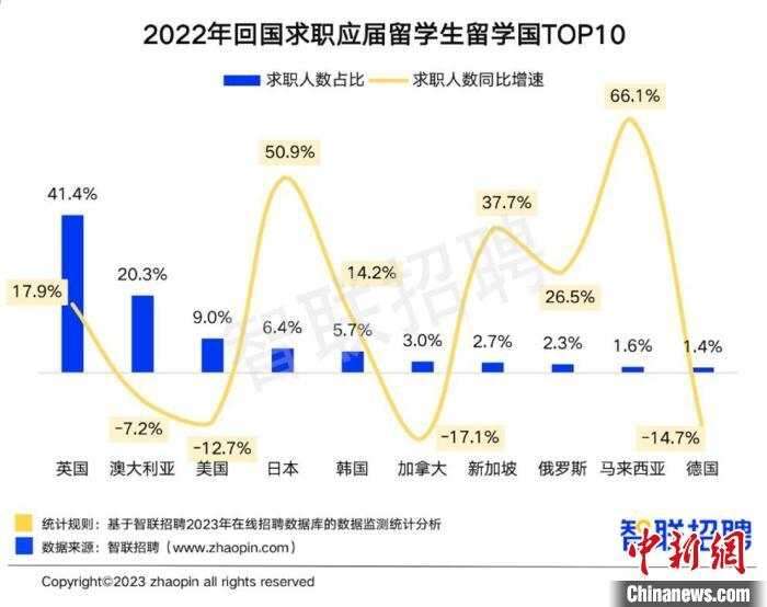 从回国求职留学生的留学国家分布来看,英国占比最高,为41.4%,其次是澳大利亚(20.3%)和美国(9%),排名与2021年一致。从同比增速来看,2022年来自马来西亚、日本、新加坡的应届留学生人数同比大幅上升,增速分别为66.1%、50.9%和37.7%。来自加拿大、德国、美国、澳大利亚的应届留学生人数同比下降。