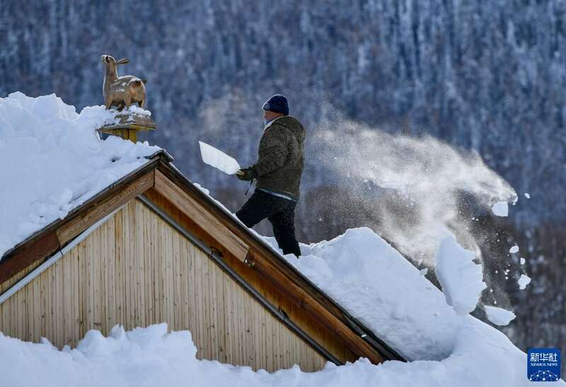 新疆阿勒泰地区禾木村村民清扫屋顶积雪(2023年1月14日摄)。新华社记者 胡虎虎 摄