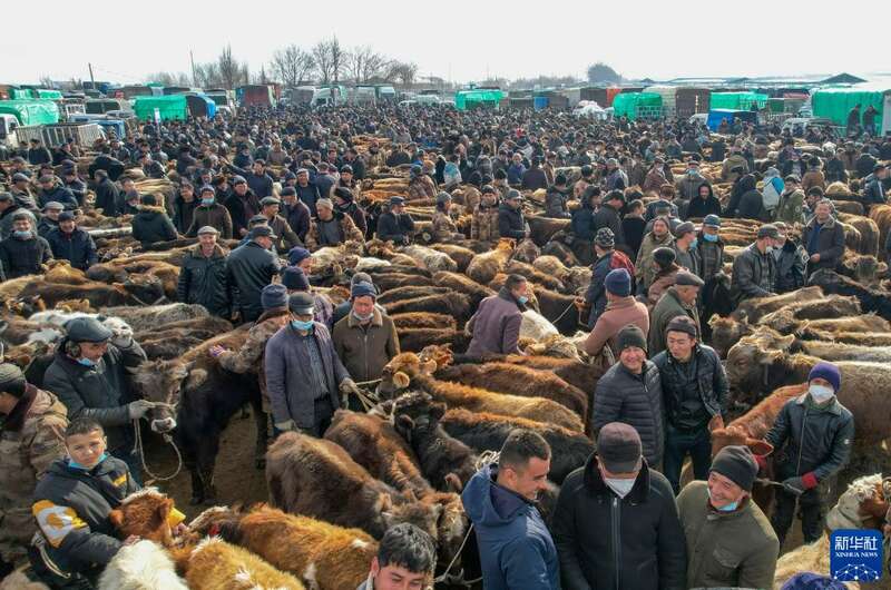 人们在新疆创锦黄公农产品交易市场交易(2023年2月1日摄,无人机照片)。当日,位于新疆伊宁县愉群翁回族乡阿勒推村的创锦黄公农产品交易市场开市,市场商品琳琅满目,牛羊马交易火爆。新华社发(刘春星 摄)