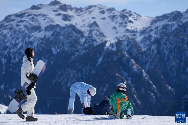 滑雪爱好者在新疆丝绸之路国际度假区滑雪场整理雪具(2023年1月25日摄)。新华社记者 赵戈 摄