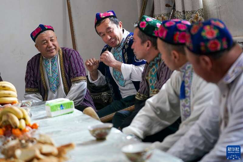 在新疆鄯善县鲁克沁镇木卡姆村,吐鲁番木卡姆传承人苏来曼·阿不都(左一)和乡村艺人聊天(2023年1月11日摄)。节庆或者聚会邀请木卡姆艺人一起演奏歌唱,是当地的传统保留节目。新华社记者 赵戈 摄