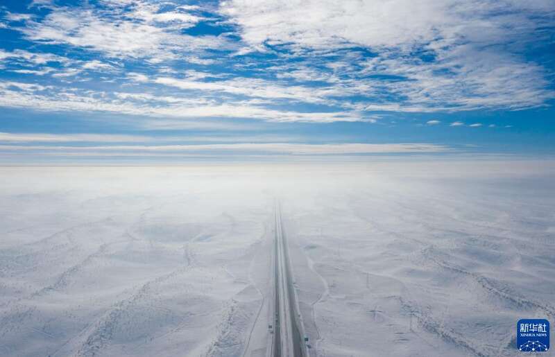 阿勒泰至乌鲁木齐的高速公路,穿越古尔班通古特沙漠(2023年1月16日摄,无人机照片)。