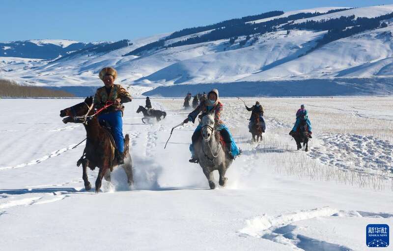 在新疆昭苏县萨尔阔布乡一处雪原上,当地农牧民进行“姑娘追”活动(2022年12月21日摄)。“姑娘追”是哈萨克族的传统马上体育运动。入冬以来,昭苏县各族农牧民开展丰富多彩的民间文化体育活动,丰富冬闲时节生活。新华社发(李文武 摄)