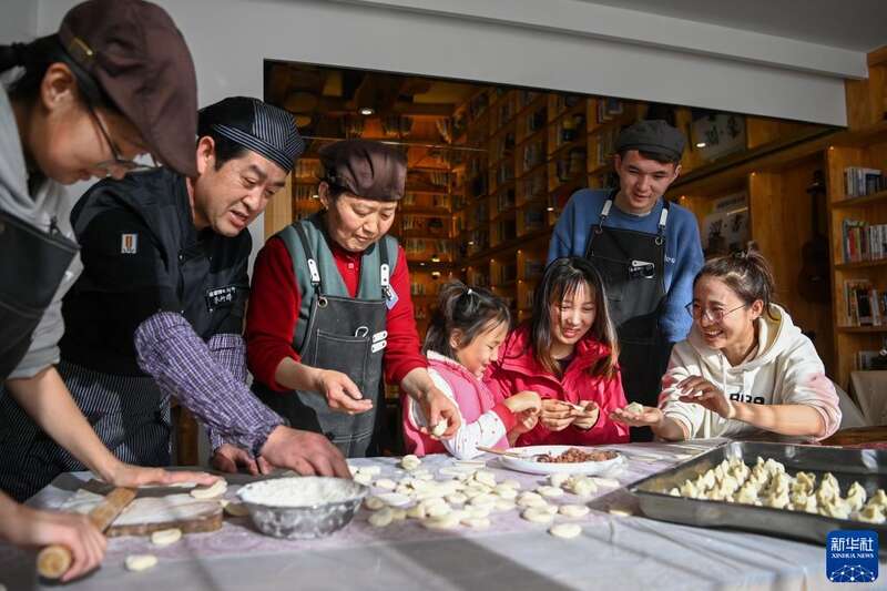 新疆乌鲁木齐县板房沟乡乐野民宿,来自广州的游客柳佳佳(右三)一家和民宿工作人员一起包饺子(2023年1月20日摄)。新华社记者 丁磊 摄