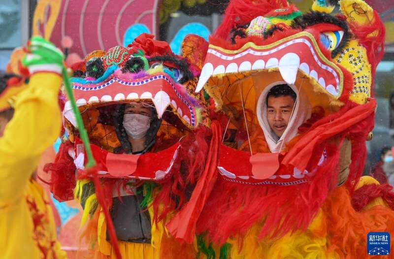 乌鲁木齐天山万科广场,民间社火团队演员在表演(2023年1月22日摄)。新华社记者 王菲 摄