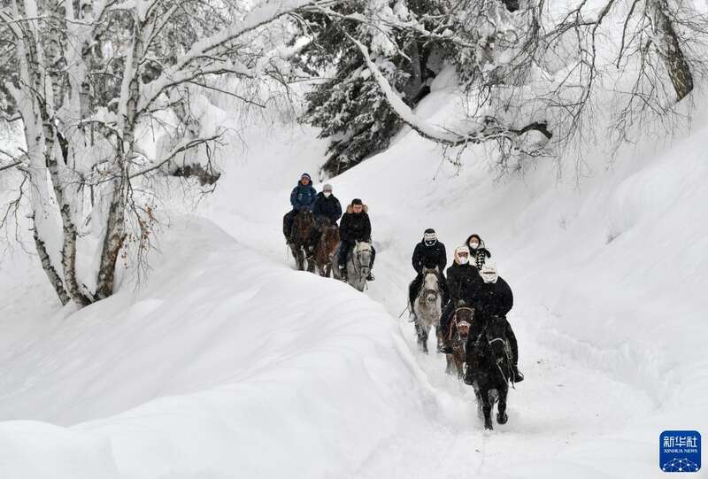 游客在新疆阿勒泰地区骑马赏雪(2023年1月7日摄)。新华社记者 胡虎虎 摄