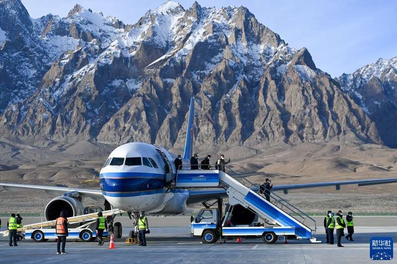 2022年12月23日,巍巍帕米尔高原上,中国最西端的运输机场——新疆塔什库尔干红其拉甫机场正式通航,冰山上迎来首批“空中来客”。新华社记者 丁磊 摄