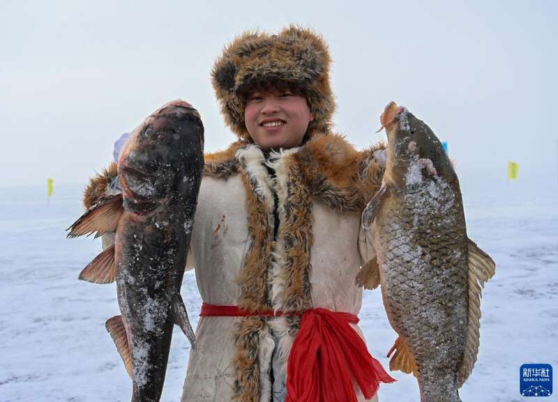 在新疆福海县第十六届乌伦古湖冬捕文化旅游节上,渔工展示劳动收获(2023年1月7日摄)。新华社记者 李响 摄