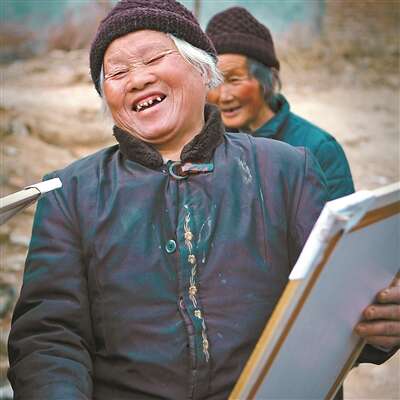 村里的大妈拿到自己的大照片笑得合不拢嘴