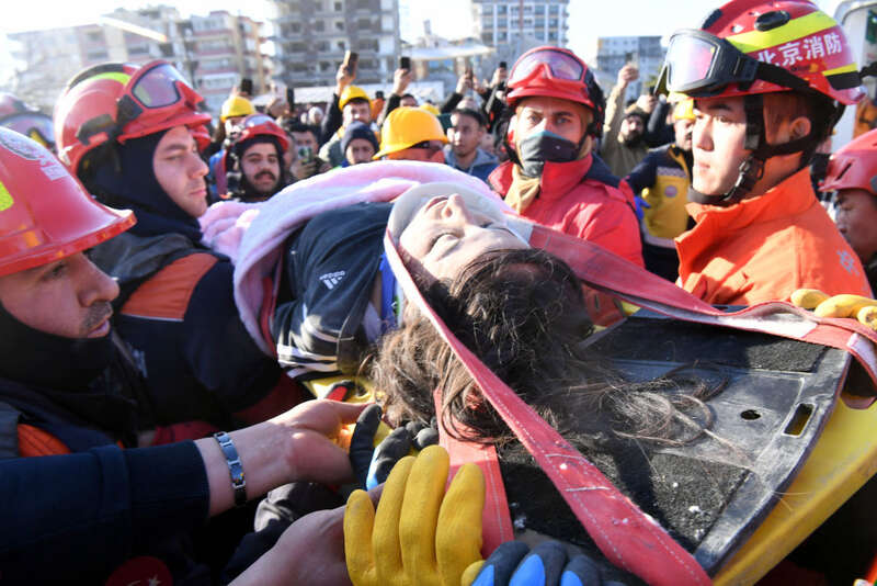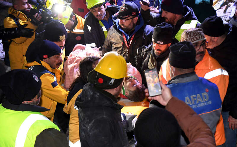 2月9日,在安塔基亚市,中国救援队与土耳其救援队转移一名救出的幸存者。