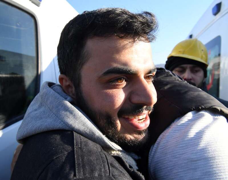 2月9日,中土救援队联手在安塔基亚市救出两名幸存者后,获救幸存者的亲人拥抱致意。