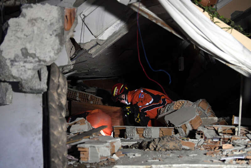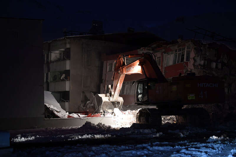 2月7日晚,在埃尔比斯坦地区,救援人员在一处地震废墟搜救。