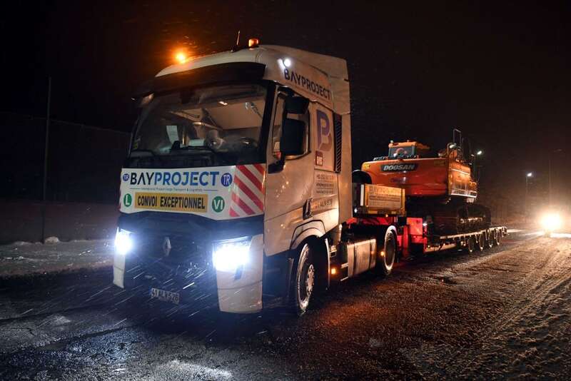 2月6日晚在土耳其伊斯坦布尔至安卡拉公路上拍摄的运往灾区的大型机械。