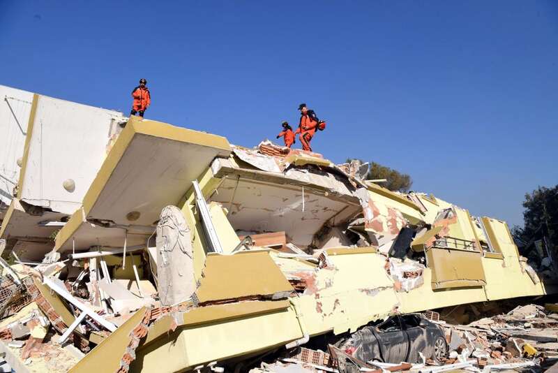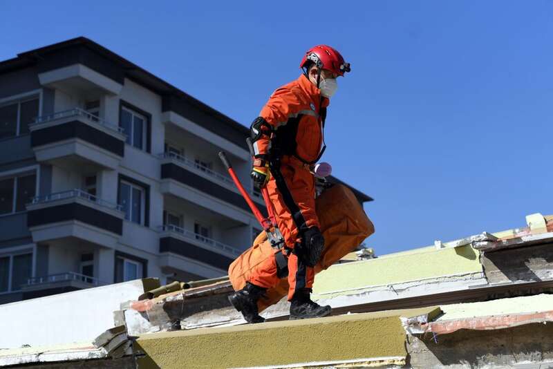 2月7日,在埃尔比斯坦地区,救援人员在一处地震废墟搜救。