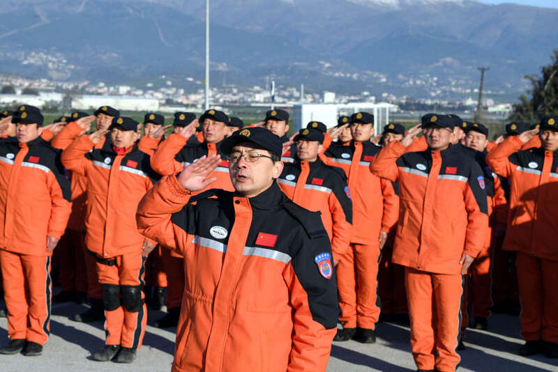2月10日,中国救援队队员在安塔基亚市的驻扎营区参加升旗仪式。