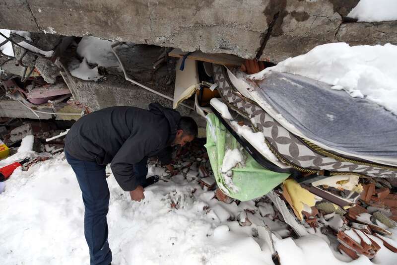 2月7日,在埃尔比斯坦地区,一名男子在地震中受损的建筑物中搜寻亲人。