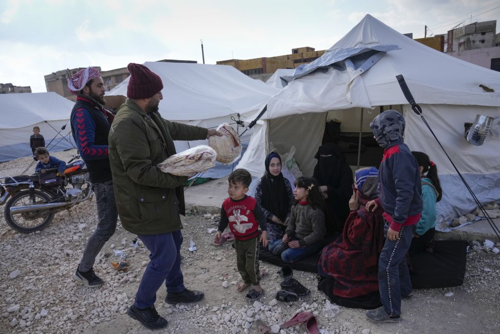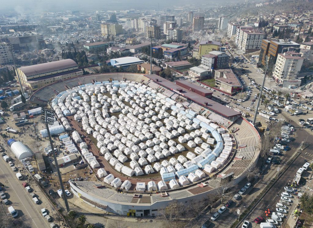 当地时间2023年2月12日,土耳其卡赫拉曼马拉什,孩子们在一个临时帐篷营地玩耍。土耳其和叙利亚边境地区发生地震近一周后,死亡人数已上升至3万多人。