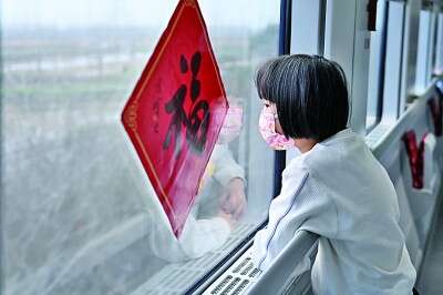 从杭州东站发往重庆北站的动车组列车上,和妈妈、弟弟一起回重庆外婆家过年的小女孩在车窗边观看沿途的风景。新华社发