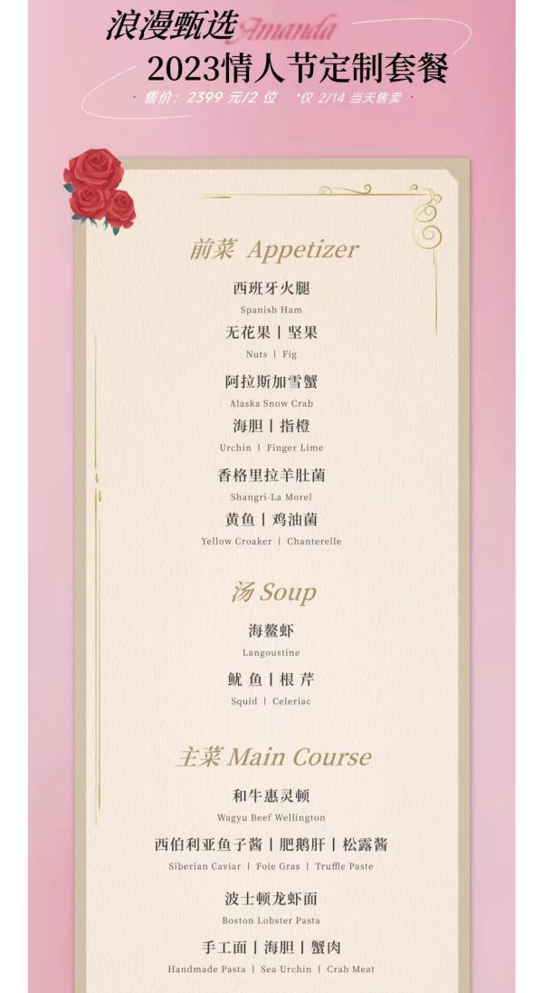 而当问起为何不能点餐时,一名法餐厅的工作人员告诉记者,“因为情人节当天,店里的客流量太大了,如果还让客人自由点餐的话,可能会影响出餐效率,反而导致顾客等餐时间长,用餐体验不佳,所以就直接由我们搭配了招牌菜组成的套餐,方便厨房快速出餐。”