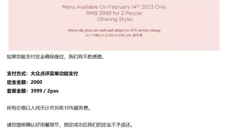 然而方玲打开那家餐厅的大众点评后发现,这家餐厅2月14当天仅提供999元一位的情人节套餐,在此基础上还要另收10%的服务费,而这家餐厅平日里的人均仅有600多元。“虽然心里很受用,感觉有被男朋友认真对待,但是看到这种收费方式,感觉就像被割了韭菜。”方玲说道。