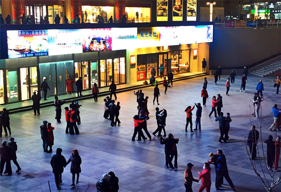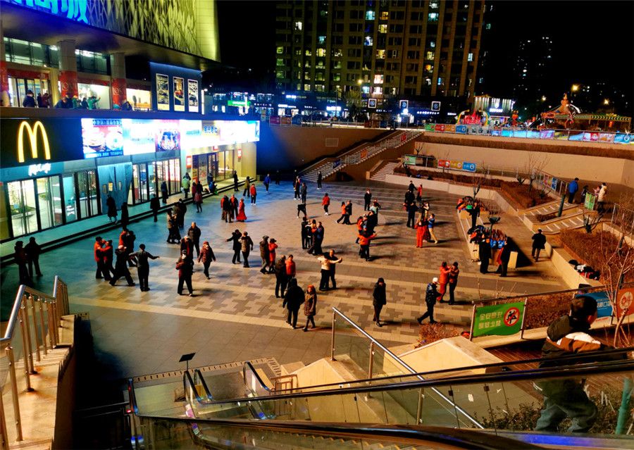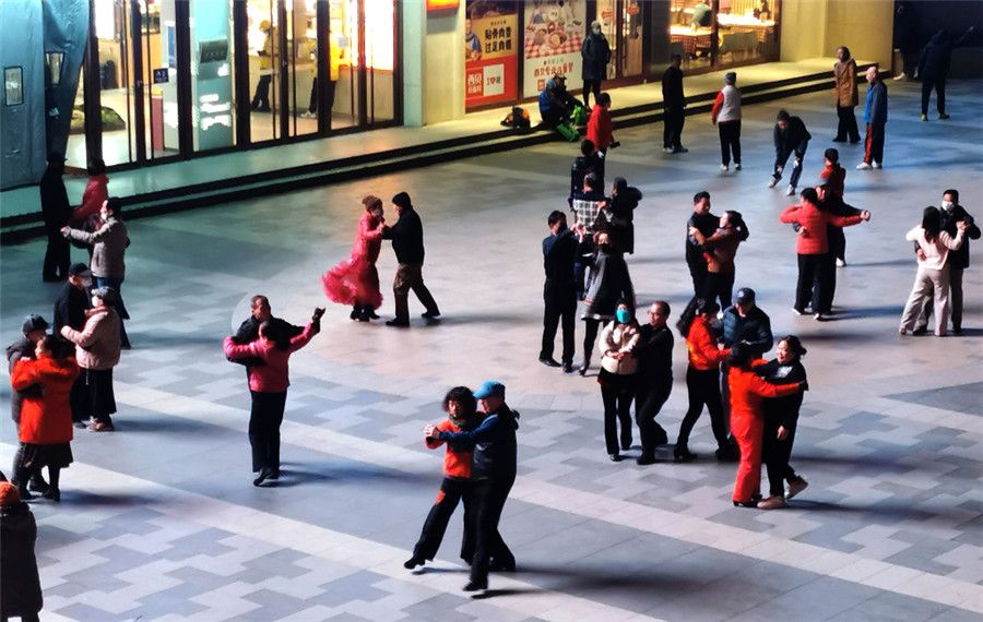 2023年2月13日,北京,石景山区一家大型商场的下沉广场,市民踏着初春的舞步在优美的旋律伴奏下翩翩起舞。