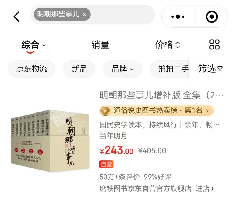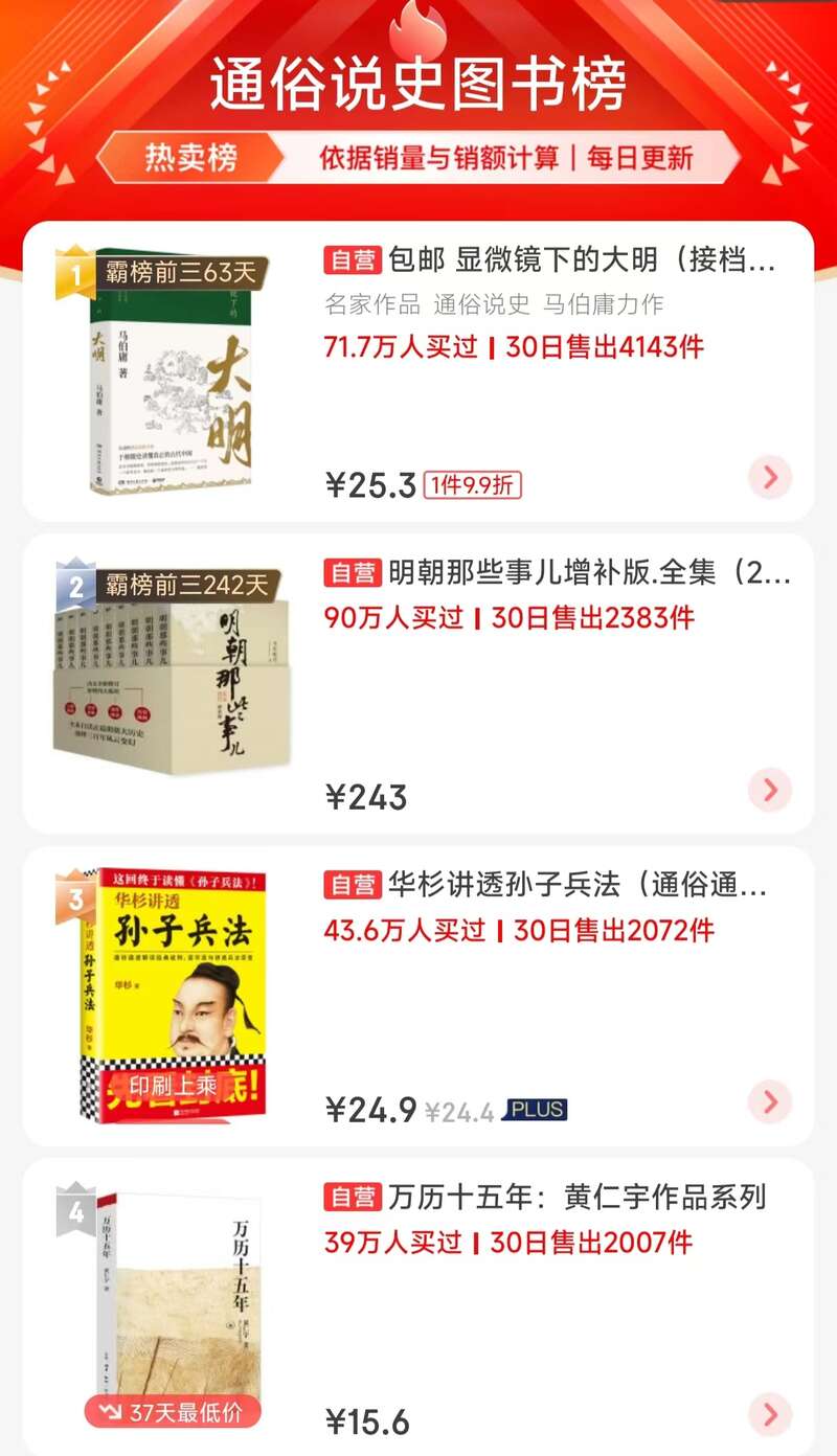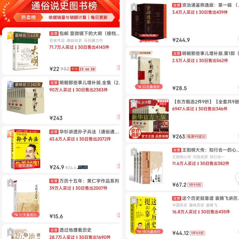 在京东图书通俗说史图书排行榜上,《明朝那些事儿增补版.全集(2021版)》《显微镜下的大明》《万历十五年》位列前三;榜单TOP10中,明史占据了5个席位;在榜单前二十名中,明史图书更是超过半数,达到了12本之多。